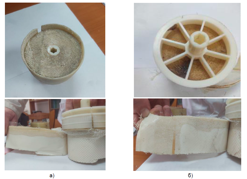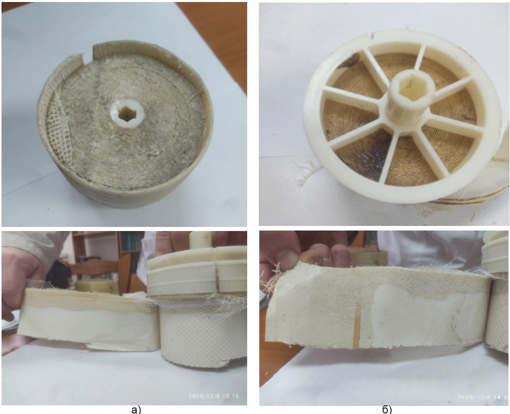 Figure 4. Photographs of the cut membranes: a) using the electromagnetic water treatment; b) without using the electromagnetic water treatment