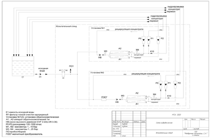 The controlled parameters of the test bench: the permeate, concentrate, recirculation line performance, pressure drop on filter F1 and elements A1–A2; total dissolved solids (hereinafter referred to as the TDS) in tank E1, in permeate and concentrate.