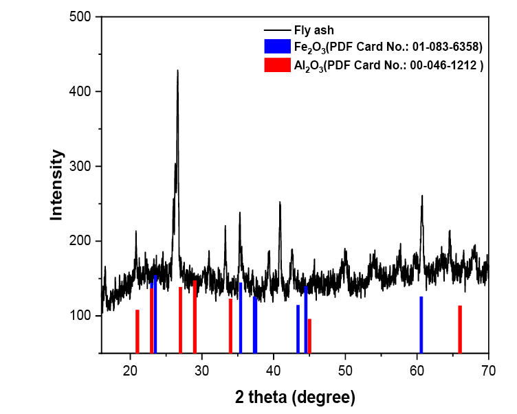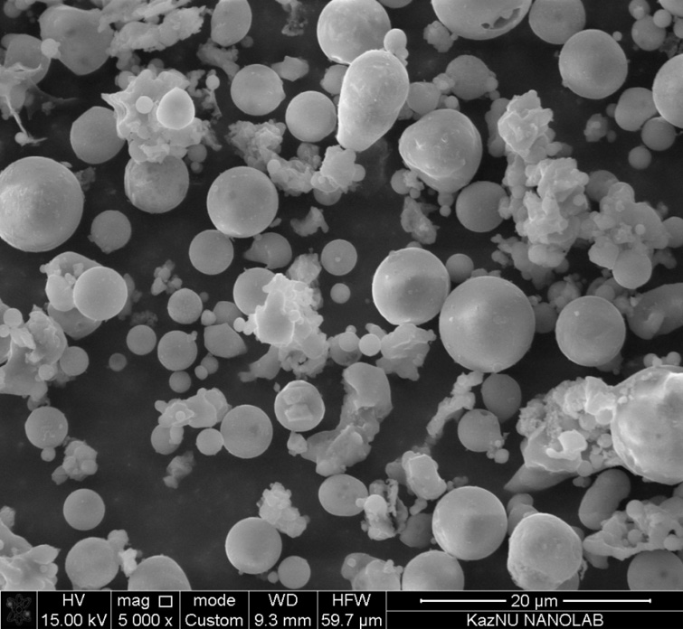 Рентгенограмма золы уноса представлена на рис. 1. Согласно полученным данным, преобладающими фазами в составе образца являются гематит (Fe2O3) и корунд (Al2O3). На графике видно, что отдельные пики образца соответствуют дифрактометрическим стандартным данным, где синие колонки – это Fe2O3, а красные – Al2O3. На рис. 2 показан снимок образца золы, полученный на сканирующем электронном микроскопе. Как можно заметить, в основном частицы имеют форму сферы по размерам, не превышающим 40 мкм. Такая форма частиц обусловлена технологическим режимом ТЭЦ, при котором под действием высокой температуры в печи происходит плавление мельчайших оксидов, содержащихся в угле, и их последующее резкое охлаждение на выходе.