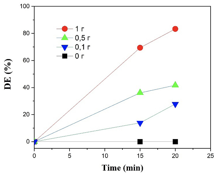 Деэмульгация проводилась в цилиндрических пробирках объемом 50 мл. Зола добавлялась в эмульсию в количестве 0,1, 0,5 и 1 г. Для сравнительного анализа использовали эталонный (холостой) образец эмульсии без золы. Каждую смесь встряхивали вручную в течение 1 мин, а затем помещали в печь при 60°C. Эффективность деэмульгирования рассчитывалась путем измерения объема воды, отделившейся от эмульсии, с учетом времени и начального объема воды по следующей формуле [7]: