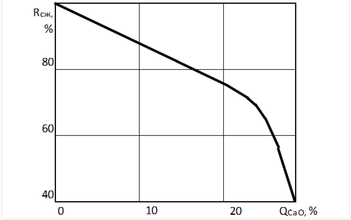 Рисунок 2. Снижение прочности цементного камня при выщелачивании извести (по данным Кинда В.В. [6])