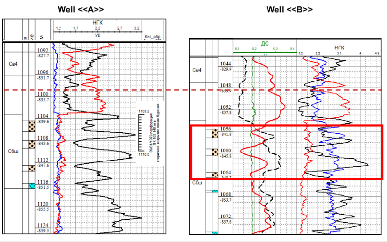 Рисунок 1. Геологический разрез в скв. A и B
