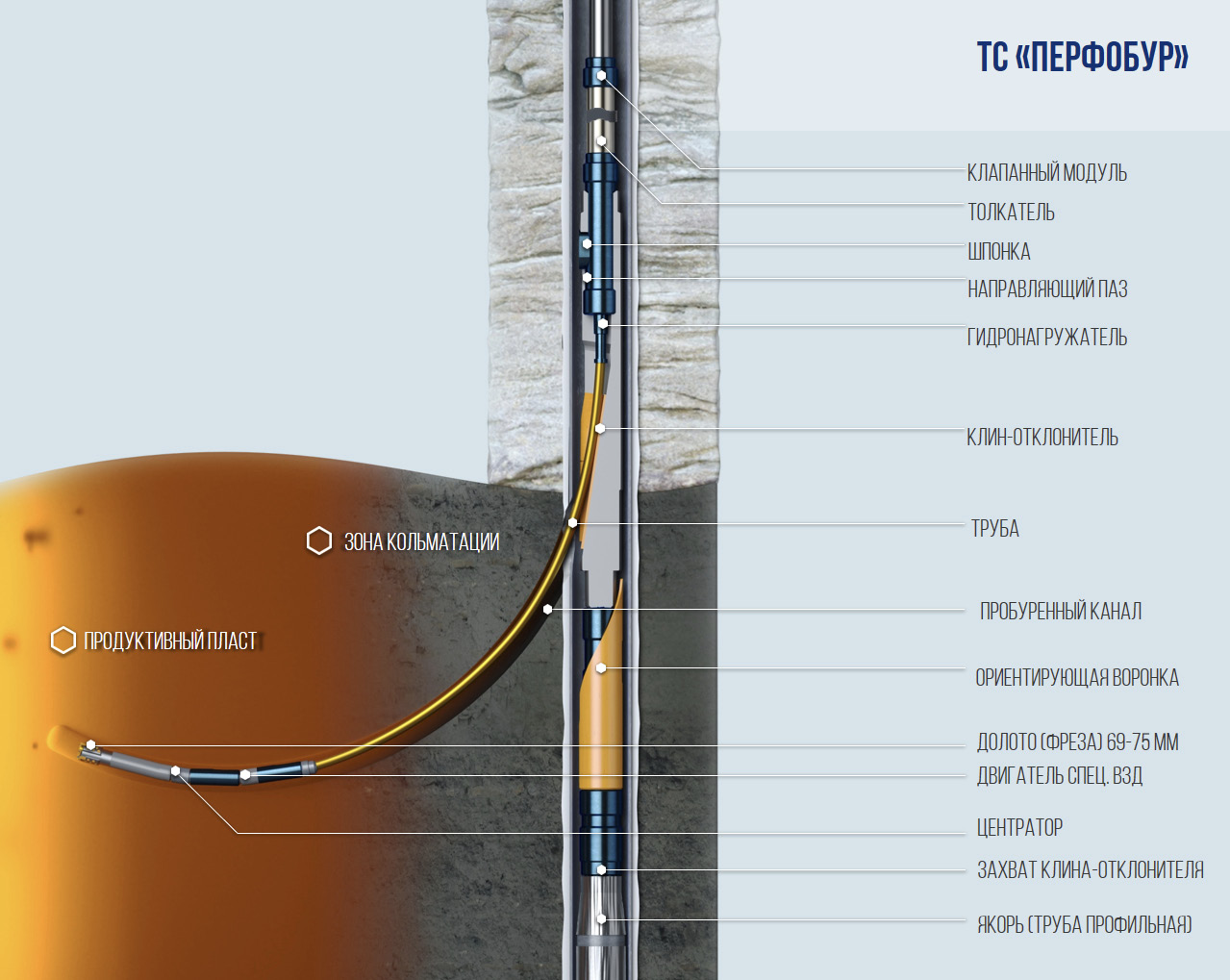 ТС «Перфобур» позволяет попадать в тонкие пласты со слабыми границами раздела, проходить через отложения пленок парафина и асфальтенов в призабойной зоне, уменьшая перепад давления в системе «ствол скважины – пласт» [1–4].