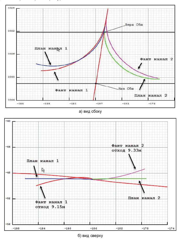 В результате измерения данных инклинометром TWIN GYRO и КВАРЦ-36 построены траектории пробуренных каналов в сравнении с запланированными (рис. 6).
