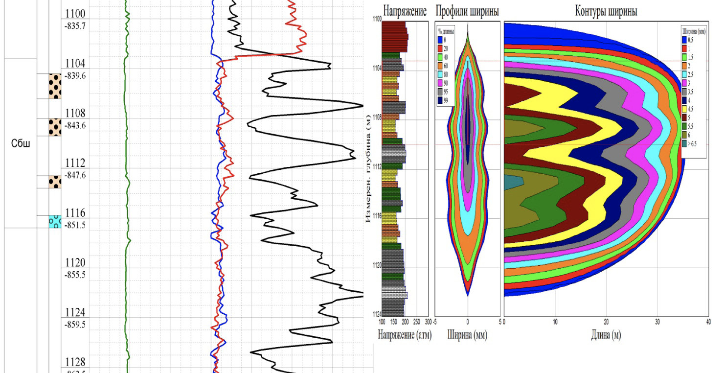 Кислотный гидроразрыв пласта (далее – КГРП) был проведен на скважине А. Перфорирован интервал 1103–1110 м. Нефтенасыщенный пласт в интервале 1112,5–1113,5 м не перфорировался для минимизации рисков прорыва в подстилающую воду. В процессе гидроразрыва (далее – ГРП) закачано 40 м3 15% HCl. Согласно модели длина трещины составила около 40 м, общая высота – 19,6 м (рис. 7).