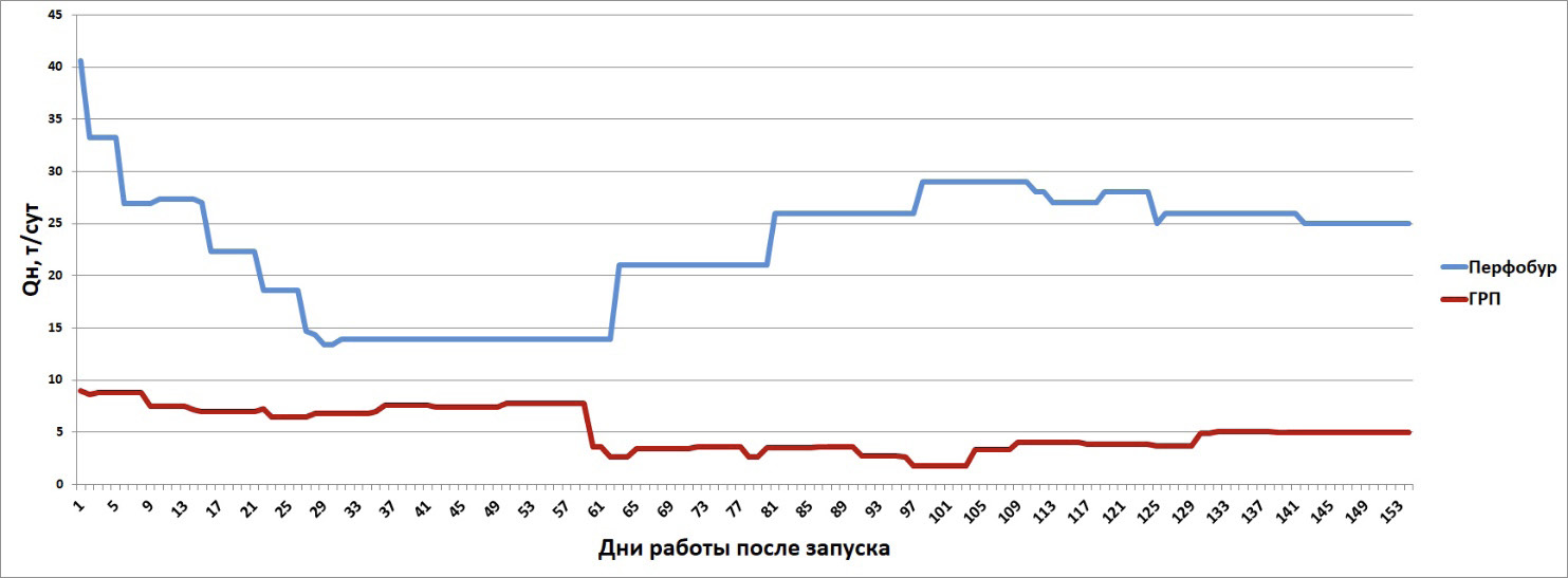 Сравнение полученных результатов на скважинах с идентичными геологическими условиями показало высокую эффективность радиального вскрытия пласта, проведенного на скважине В, – более чем в 2,5 раза при меньшей обводненности, а именно: по скважине В – 10%, по скважине А – 28%.