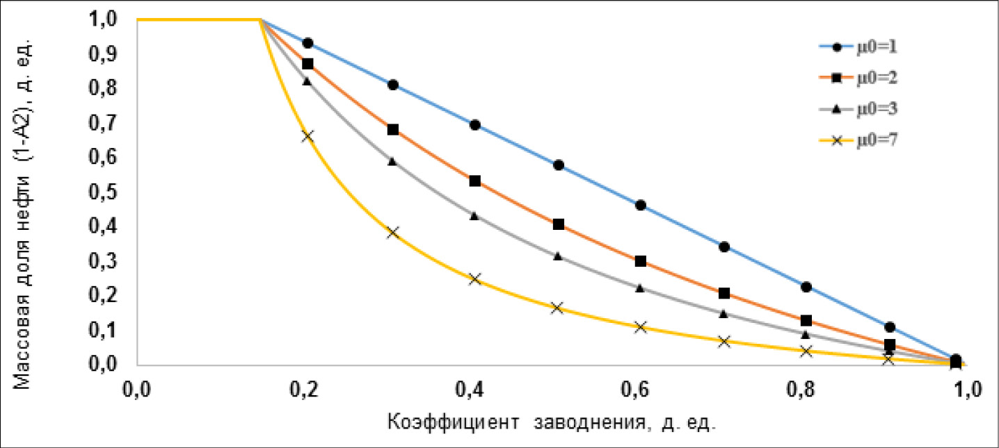 где (1 – А) – расчетная доля нефти в дебите жидкости (при предположении µ0 = 1), (1 – А2) – весовая доля нефти в дебите жидкости.