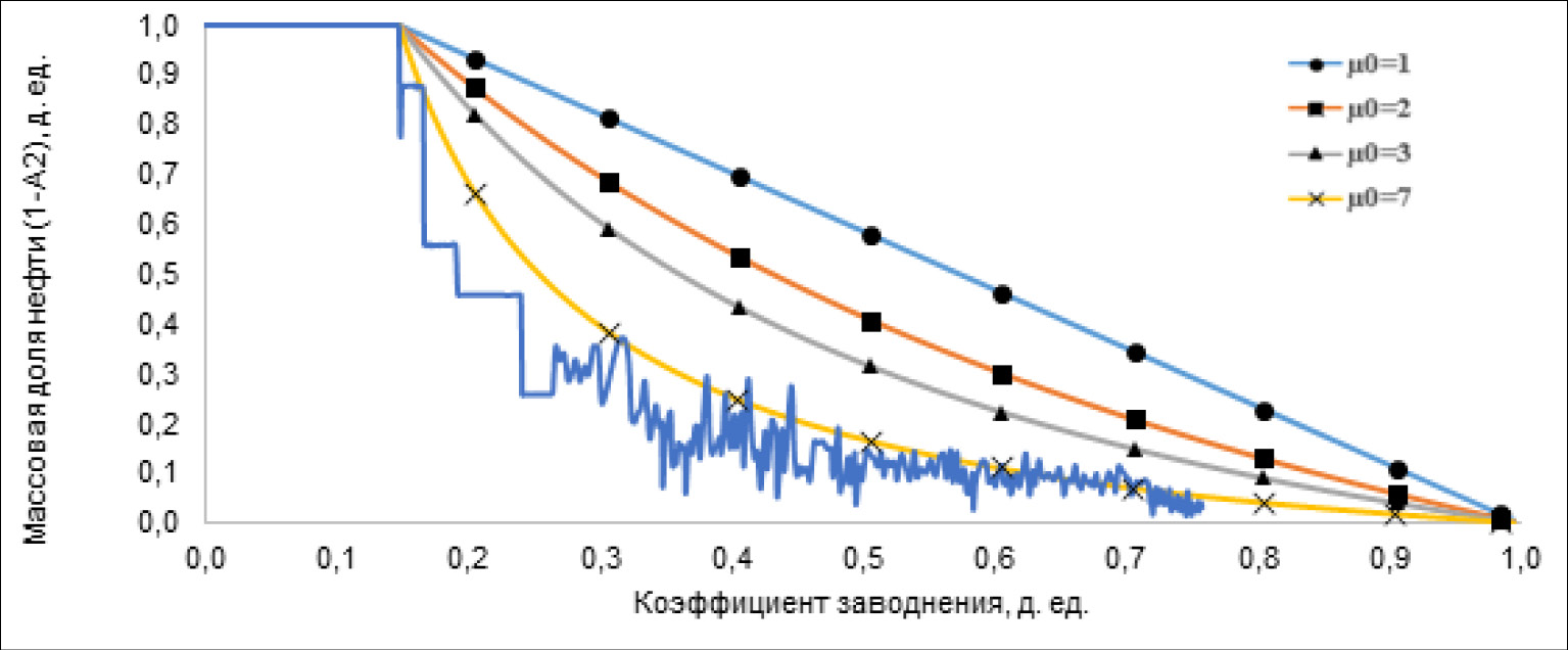 Рисунок 2. Зависимость весовой доли нефти в дебите жидкости от коэффициента различия физических свойств нефти и вытесняющего агента (µ0) по скв. 60