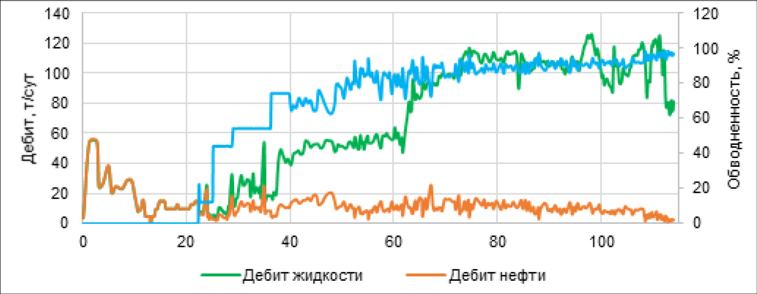 Скв. 60 эксплуатируется винтовым насосом на горизонте Ю-1С с 1977 г. На текущий момент накопленная добыча нефти составляет 114 тыс. т, обводненность – 97%.