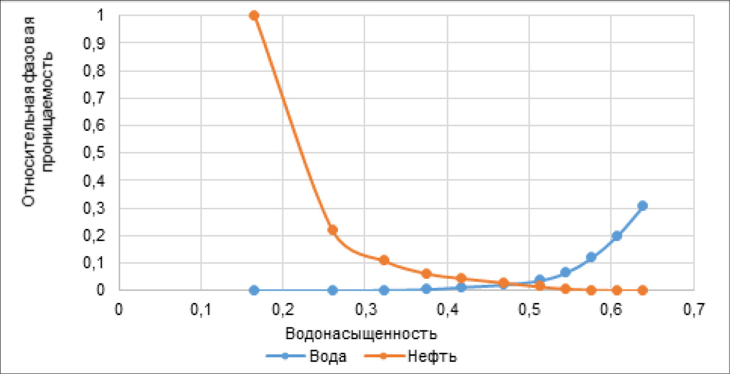 При определении µ0 через коэффициент вытеснения (Квыт) и свойств нефти и вытесняющего агента были использованы данные, полученные при исследовании относительных фазовых проницаемостей (далее – ОФП) на скв. 6125. Причинами выбора данных скв. 6125 являются полученные образцы керна на том же горизонте, на котором эксплуатируется исследуемая скв. 60. При определении коэффициента вытеснения нефти водой на скв. 6125 была использована модель пластовой нефти, где вязкость µмпн = 23 мПа·с. После расчета относительных фазовых проницаемостей были получены значения остаточной нефтенасыщенности (βон = 0,361), остаточной водонасыщенности (βов = 0,165) и значение коэффициента вытеснения Кв = 0,5677.