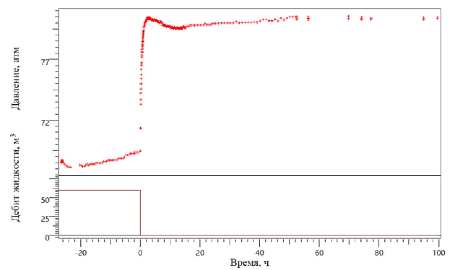 Для определения коэффициента продуктивности жидкости и нефти после обводнения были проведены гидродинамические исследования скважин (далее – ГДИС) методом кривой восстановления уровня. Также перед закрытием скважины на исследование были замерены динамические уровни, затрубные давления, дебиты жидкости и отобраны устьевые пробы для определения режима работы скважины. Регистрация показателей произведена прибором «СУДОС-автомат». Согласно предоставленным данным, количество замеренных точек составило 248. Путем пересчета уровня жидкости в давление построен график кривой восстановления давления (рис. 5). Время закрытия скважины составило 99,6 ч. Далее в программу Saphir были введены необходимые исходные параметры для интерпретации кривой восстановления давления (далее – КВД) (табл. 1).