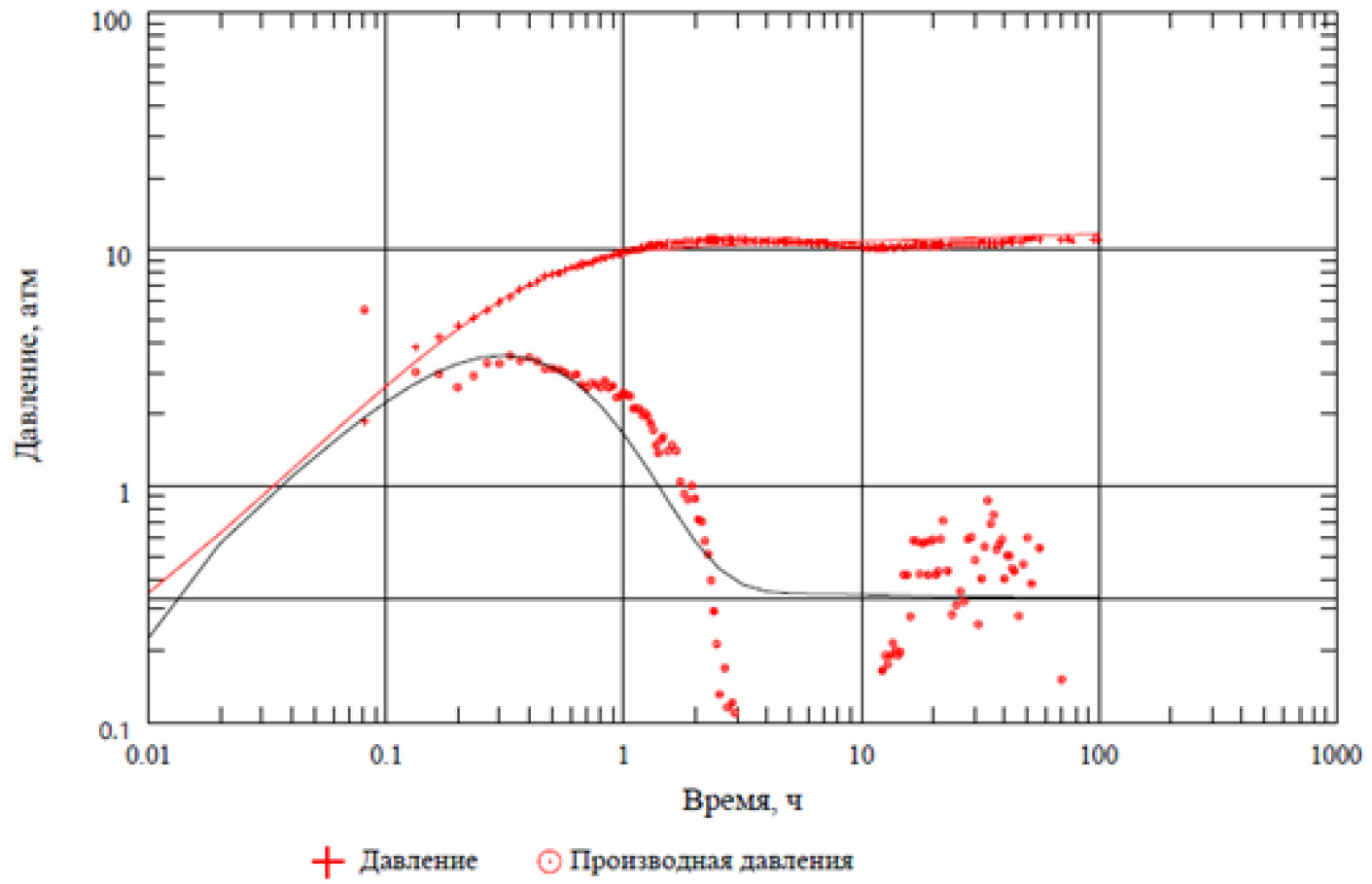 В процессе дальнейшей интерпретации были построены билогарифмический график (log-log plot) изменения давления во времени с его производной от времени (рис. 6) и полулогарифмический график (рис. 7).