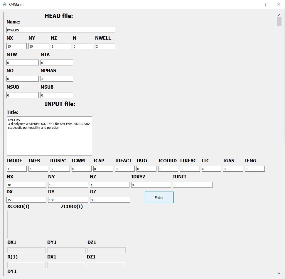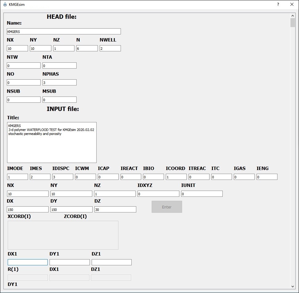 Второй этап работы связан непосредственно с основной целью работы, а именно с разработкой окна пользовательского интерфейса гидродинамического симулятора для контроля ввода данных и удобства запуска на расчёт. На данном этапе основными задачами являются создание объектов однострочного (lineEdit) и многострочного (textEdit) текстовых полей элементов ввода [8] в окне ввода данных (рис. 2) для каждого параметра, а также формирование групп параметров. Формирование групп параметров осуществляется для соблюдения алгоритма зависимости между входными параметрами, составленного на первом этапе данной работы. Строки, заканчивающиеся на кнопку «Enter», свидетельствуют о завершении формирующейся группы. Для формирования группы и вставки кнопки «Enter» составляется совокупность параметров. При этом важным условием является зависимость между строками параметров, состоящих в группе, и следующей по порядку строкой параметров, не состоящей в группе. Если в последующей строке нет параметров, которые зависят от параметров формируемой группы, то данная строка вносится в группу. Такой отбор происходит до тех пор, пока не будет обнаружен параметр в строке, который будет зависеть от параметров формируемой группы. Эта строка, соответственно, и становится концом группы.