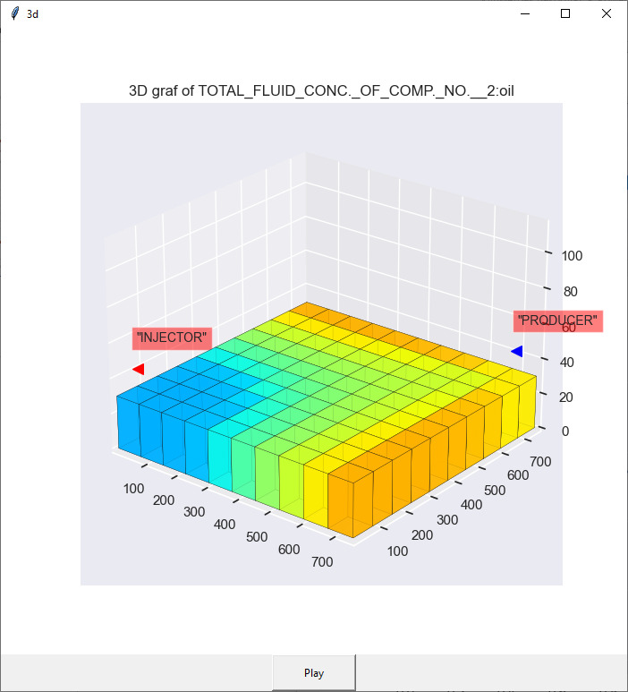 Для визуализации трехмерного графика полей концентраций, насыщенностей и давлений используются модули plot_3D и Color. С помощью plot_3D создается трехмерное пространство, в которое циклично добавляются ячейки по координатам, полученным из файла с расширением MESH. Для наблюдения изменения значений физических свойств, таких как давление, насыщенности фаз и концентрации компонентов, в каждой ячейке по времени в режиме анимации используется функция Animate. Модуль Color определяет цвет ячейки согласно численному значению той или иной характеристики фаз/компонентов.
