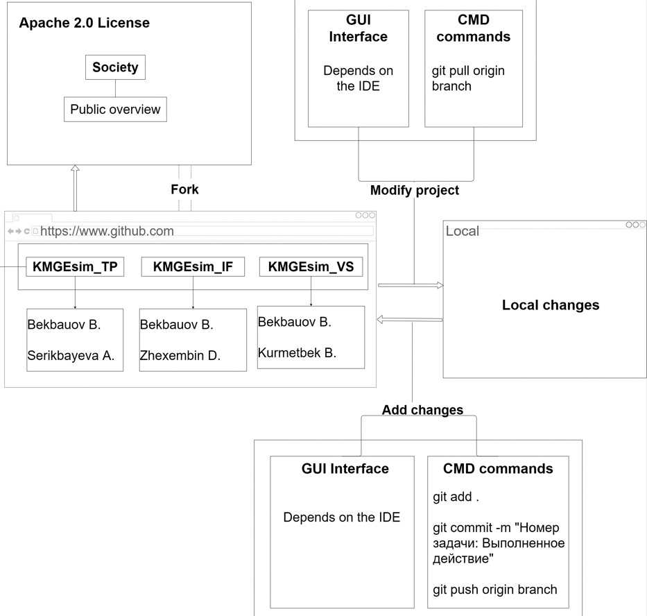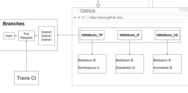 Разработанная в рамках данной работы архитектура, представленная на рис. 10, позволит налаживать рабочий процесс и взаимодействие внутри команды. Создана организация на GitHub для проекта KMGEsim, которая на данный момент имеет приватный характер. KMGEsim состоит из трех проектов с наименованиями KMGEsim_TP, KMGEsim_IF и KMGEsim_VS.