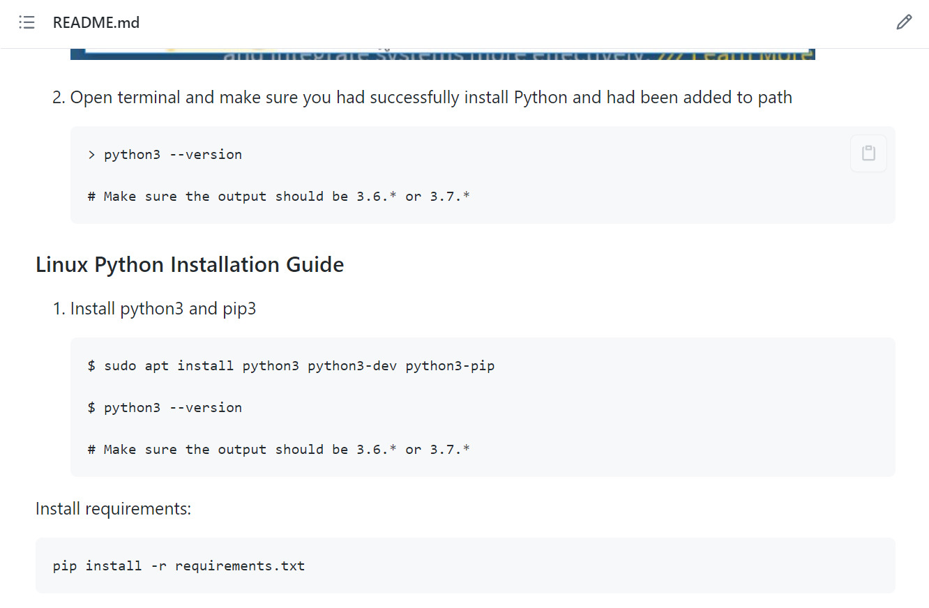Документация. Проекты с открытым исходным кодом нуждаются в документации, описывающей используемые шаблоны проектирования, стандарты работы и всё, что может помочь новым участникам войти в курс дела. Документация зачастую находится в главной ветке в файле README.md, используется для инструктажа запуска проекта и использования его. На рис. 15 представлена документация по проекту KMGEsim_VS, в которой демонстрируется инструктаж для установки и запуска проекта с облака GitHub на локальный компьютер, а именно добавление установочных файлов и программ, которые включают python3 и pip3.
