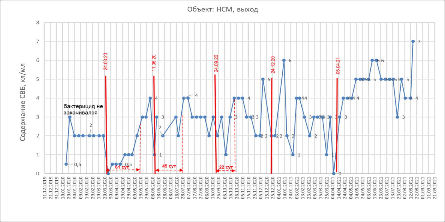 В 2021 г. на основании полученных результатов предыдущего года была приостановлена постоянная закачка бактерицида на входе НСМ-4.