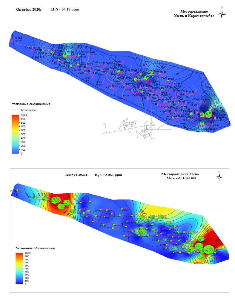 Представлены карты содержания сероводорода по ГУ за октябрь 2020 г. и август 2021 г. на рис. 5.