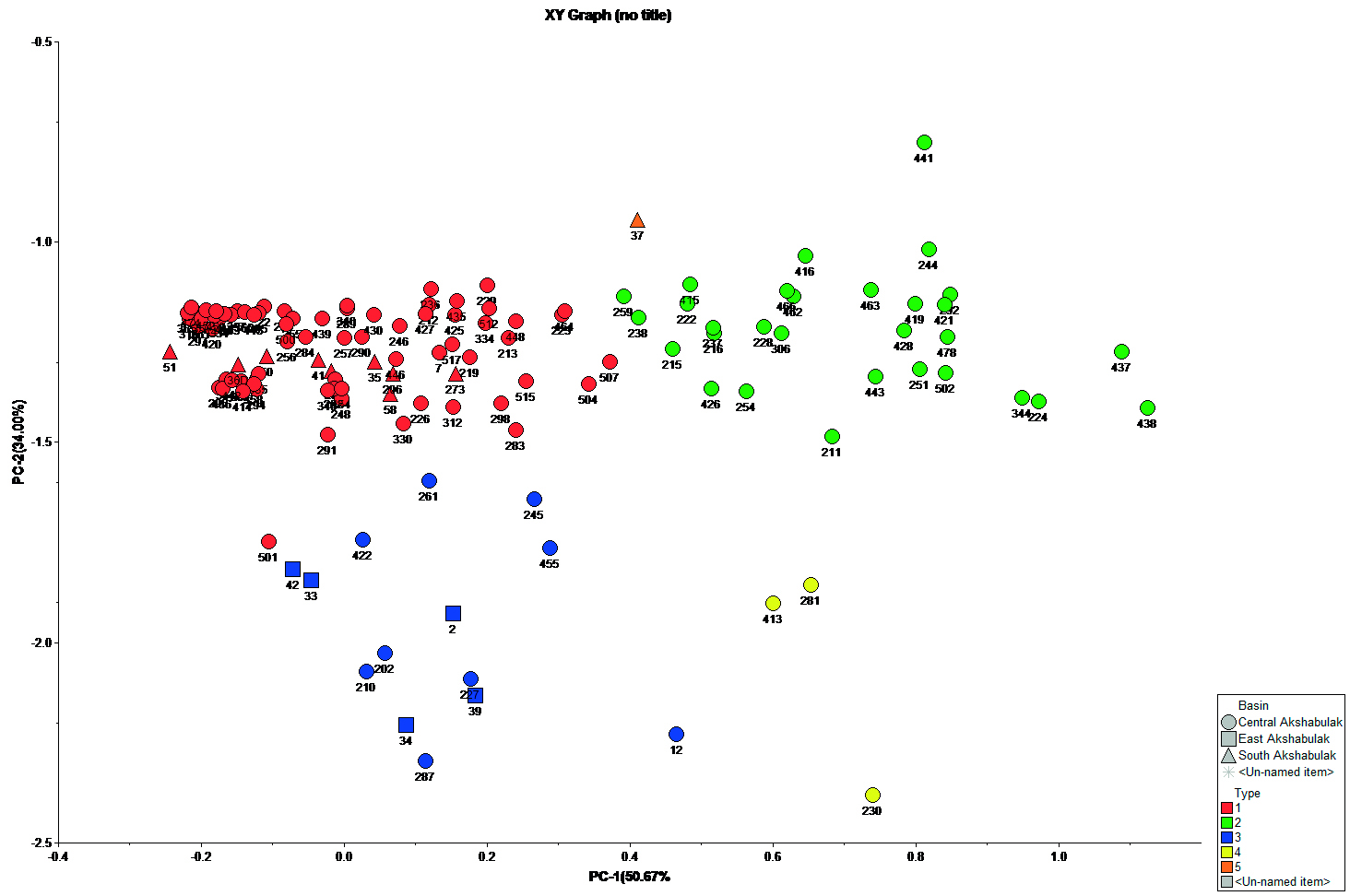 This article presents the results of fingerprinting of 128 oil samples derived from all production wells of three Akshabulak group fields to determine the types of oils. Based on the results of this analysis, four groups of oils were identified: The first group includes oils (red) of the lower hydrocarbon pay zones (III-IV-V) in Akshabulak Central, the upper zones of the I southern dome of Akshabulak Central and all pay zones of the northern dome at Akshabulak South. The second group of oils (green) was identified in the wells exploiting pay zone I in the northern dome of Akshabulak Central, while oils (blue) in the productive horizons of Akshabulak East and paleochannel sediments of Akshabulak Central form the third group. The fourth group includes one oil sample with different genesis from well № 37, which penetrates paleo-channel № 13 at South Akshabulak.