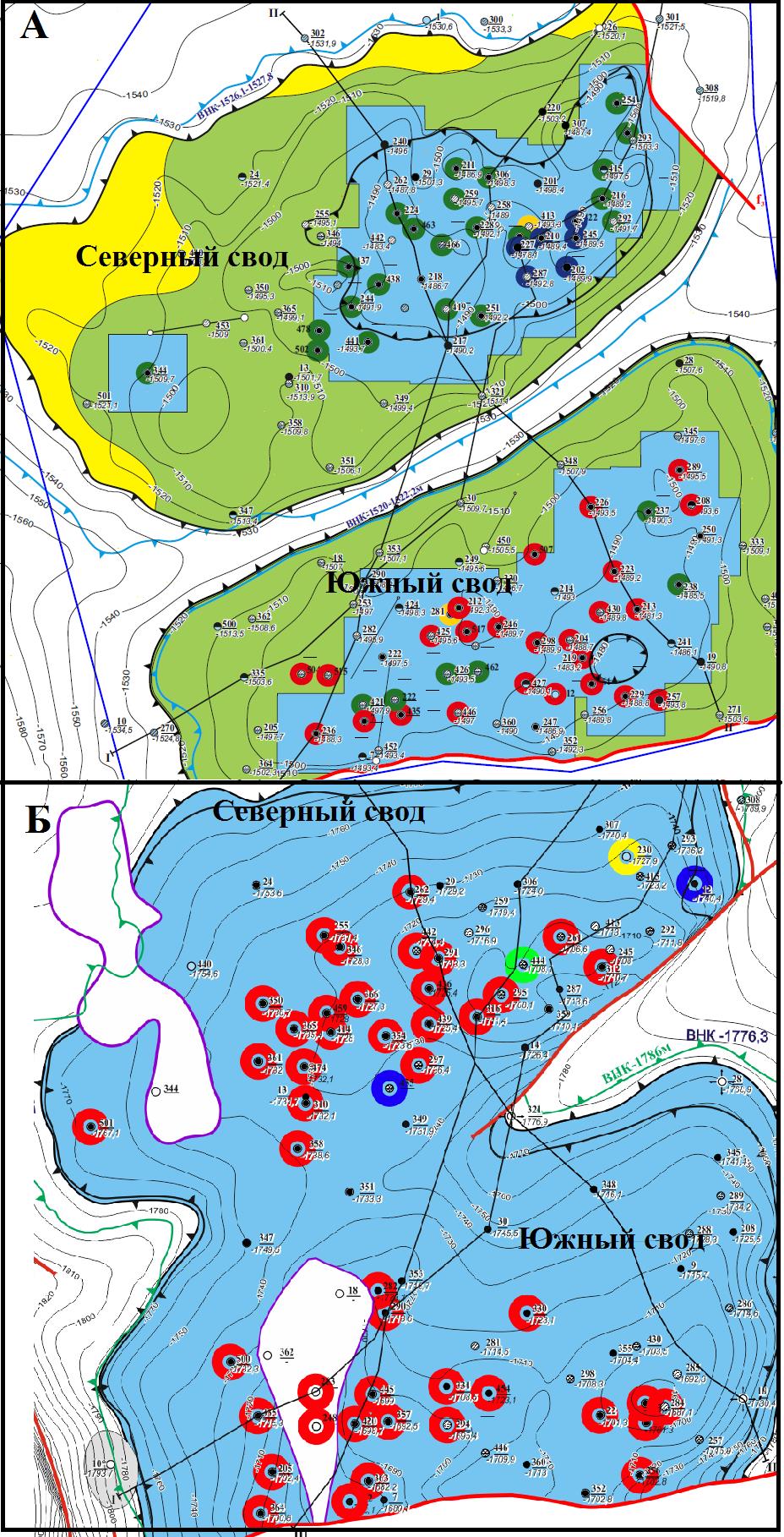 Рисунок 6. Карта распространения выделенных типов нефти Восточного Акшабулак(а) и Южного Акшабулак(б) по фингерпринтингу