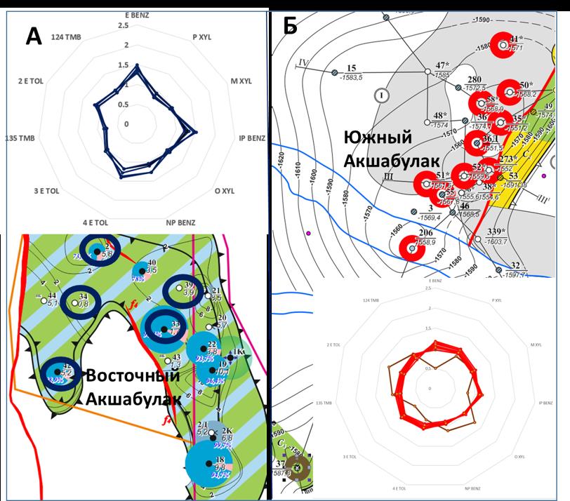 В третью группу попадают нефти (синие) Акшабулак Восточный (рис. 6а) и нефти руслового отложения (объект II) Центрального Акшабулак (рис. 5), в то время как подгруппу смеси (желтые) составляют нефти всего трех скважин (№230, 413 и 281) Центрального Акшабулак. Вероятно, залежи в палеоруслах (глубина 1700–1500 м) на Центральном Акшабулак образовались за счет миграции УВ из нижней части Восточного Акшабулак (глубина 2000–2100 м) через русла. Для подтверждения единства резервуара и одинаковых условий резервуара в пределах всего м. Восточного Акшабулак рекомендуется провести аналогичные исследования на нефти Восточного Акшабулак, принадлежащего к территориям компании ТОО «СаутсОйл».