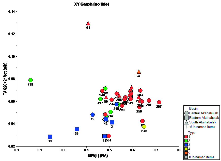Рисунок 12. График зависимости соотношений триароматических стероидов TAS против индекса метилфенантрена в нефтях Акшабулакской группы