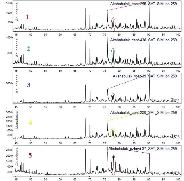 Ввиду уменьшения ресурсной базы в последние годы ТОО «СП Казгермунай» уделяет особое внимание разведке новых нефтегазоносных структур. В 2015 г. на базе лаборатории Атырауского филиала (далее – АФ) ТОО «КМГ Инжиниринг» проводилось изучение биомаркерного состава 8 образцов нефти м. Акшабулак Центральный (№ 7, 12, 222, 344, 258, 284, 286) и 3 образца нефти м. Акшабулак Южный (№ 35, 41 и 273) в режиме MRM (Multiple Reaction Monitoring), по результатам которого выявлено, что все нефти обладают идентичными составами биомаркеров и образовались из глинистого органического вещества (далее – ОВ), осаждавшегося в озерной среде с вкладами наземных ОВ [2]. Тогда аналогичное изучение нефти Акшабулак Восточный не проводилось. Также не проводился фингерпринтинг нефти, т.к. применение данного метода началось в Казахстане впервые на базе лаборатории АФ «КМГ Инжиниринг» в 2016 г. В 2020 г. проводилось ещё комплексное геохимическое изучение (биомаркерный анализ, Рок-Эвал пиролиз, отражательная способность витринита, мацеральный анализ) керна скв. № 33 Восточного Акшабулака и скв. № 316 Центрального Акшабулака (2 пробы из фундамента, инт. -1861 м), которые были пробурены до палеозойских отложений. По результатам данного исследования, пробы керна не являются нефтематеринскими породами и обладают очень низкими генерационными потенциалами, что не требует дальнейшей интерпретации. Черты сходства биомаркерного состава УВ из этих кернов и ранее исследованных нефтей месторождений Акшабулак позволяют утверждать, что они генетически едины, хотя УВ в исследованных интервалах керна скв. № 33 м. Восточный Акшабулак можно рассматривать остаточными (residual) [3].