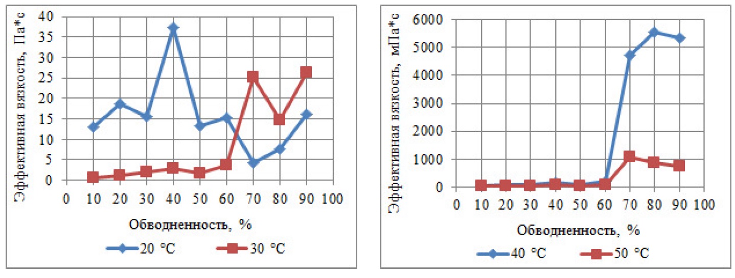 Проведенные лабораторные исследования показали, что, в отличие от температуры 20°С, увеличение содержания пластовой воды в нефтяных эмульсиях более 60% приводит к значительному росту вязкости при температурах 30, 40 и 50°С (рис. 2).