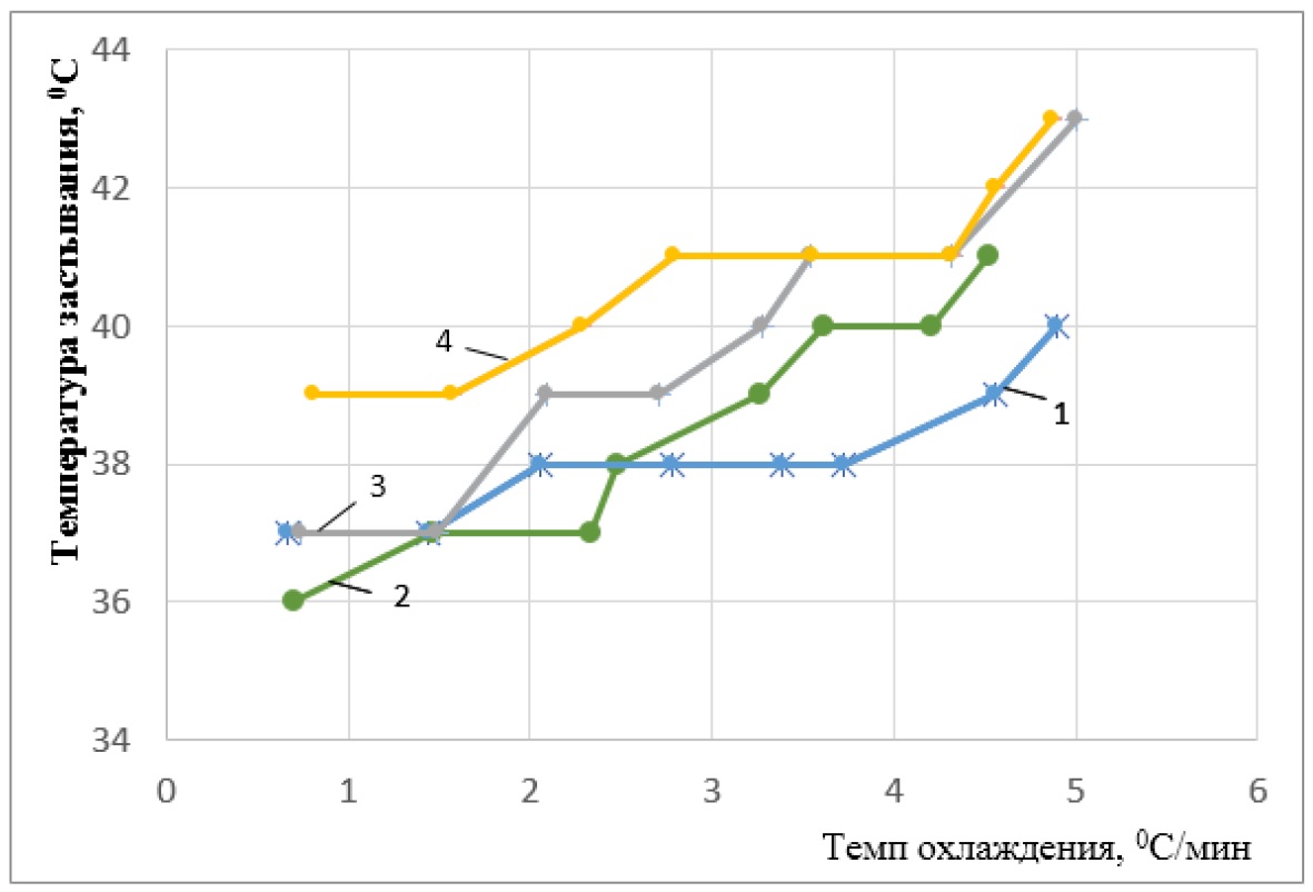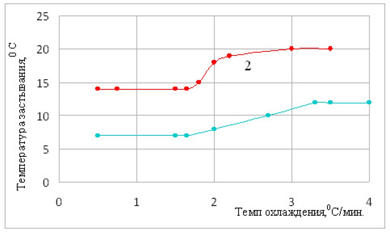 В результате проведенных исследований установлено, что темп охлаждения определяется закономерностями кристаллизации парафинов. Для каждой нефтяной эмульсии существует определенный темп охлаждения, при котором температура застывания оказывается минимальной.